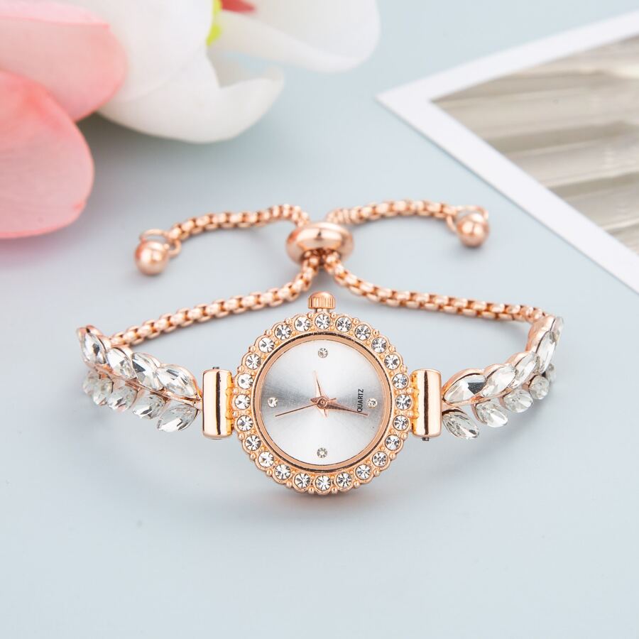 این ساعت با بند دستبندی خود که با جزئیات ظریف برگ و کریستال‌های درخشان تزئین شده، نگاه هر بیننده‌ای را به خود جلب می‌کند. صفحه گرد و کوچک آن، ظرافت این محصول را دوچندان کرده و آن را به یک اکسسوری ایده‌آل تبدیل نموده است.
