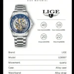 ساعت مچی مردانه LIGE با طراحی منحصربه‌فرد اسکلتون (Hollow-Out)