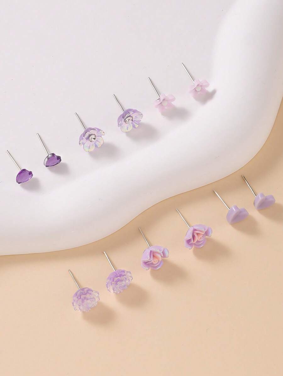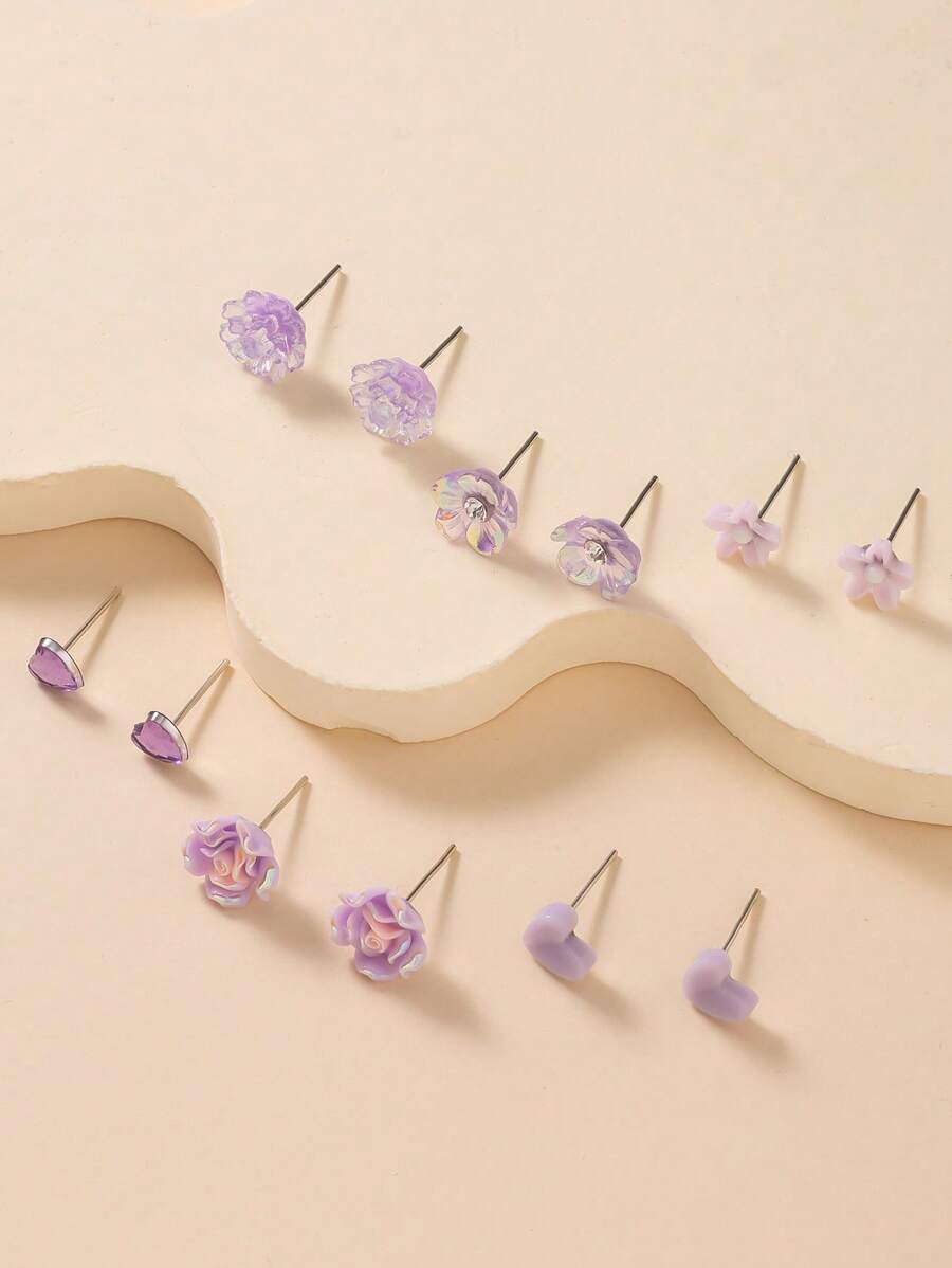 ست 6 تکه گوشواره میخی مدل Floral Heart — گوشوارههای فلزی و رزینی چندرنگ، ظریف و مناسب استفاده روزمره و هدیه.